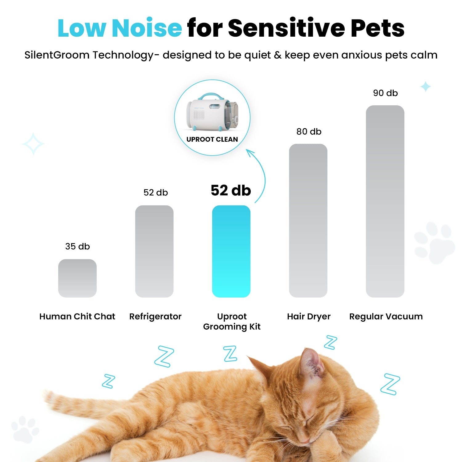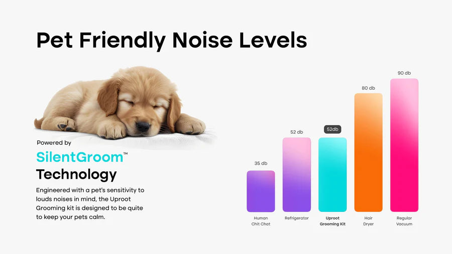 We know pets are sensitive to noises, especially cats. Given that, we have developed a proprietary noise suppression technology - SilentGroom - to reduce the noise to a level both dogs and cats alike are comfortable with!