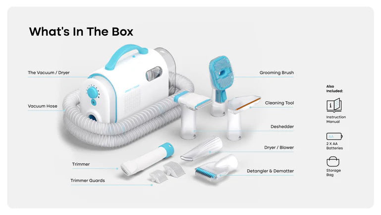 Each Uproot Pet Grooming Kit comes with: 1x Kit 1x Hose 1x Grooming Brush 1x Detangler 1x Deshedder 1x Cleaner 1x Trimmer 4x Trimmer Guards 1x Blower 2x AA Batteries for the Trimmer 1x Bag to hold accessories 1x User Manual
